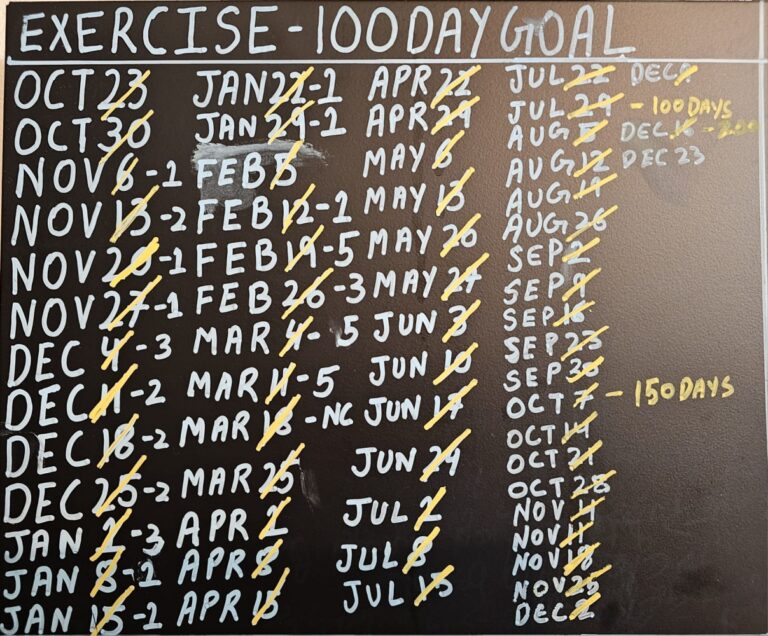 On March 18, I implemented my new calendar (“NC” on the board). On July 29, I hit 100 consecutive days of working out without missing a day. I took it a step further and reached 150 days on October 7, and on December 16, I made it to 200 days.