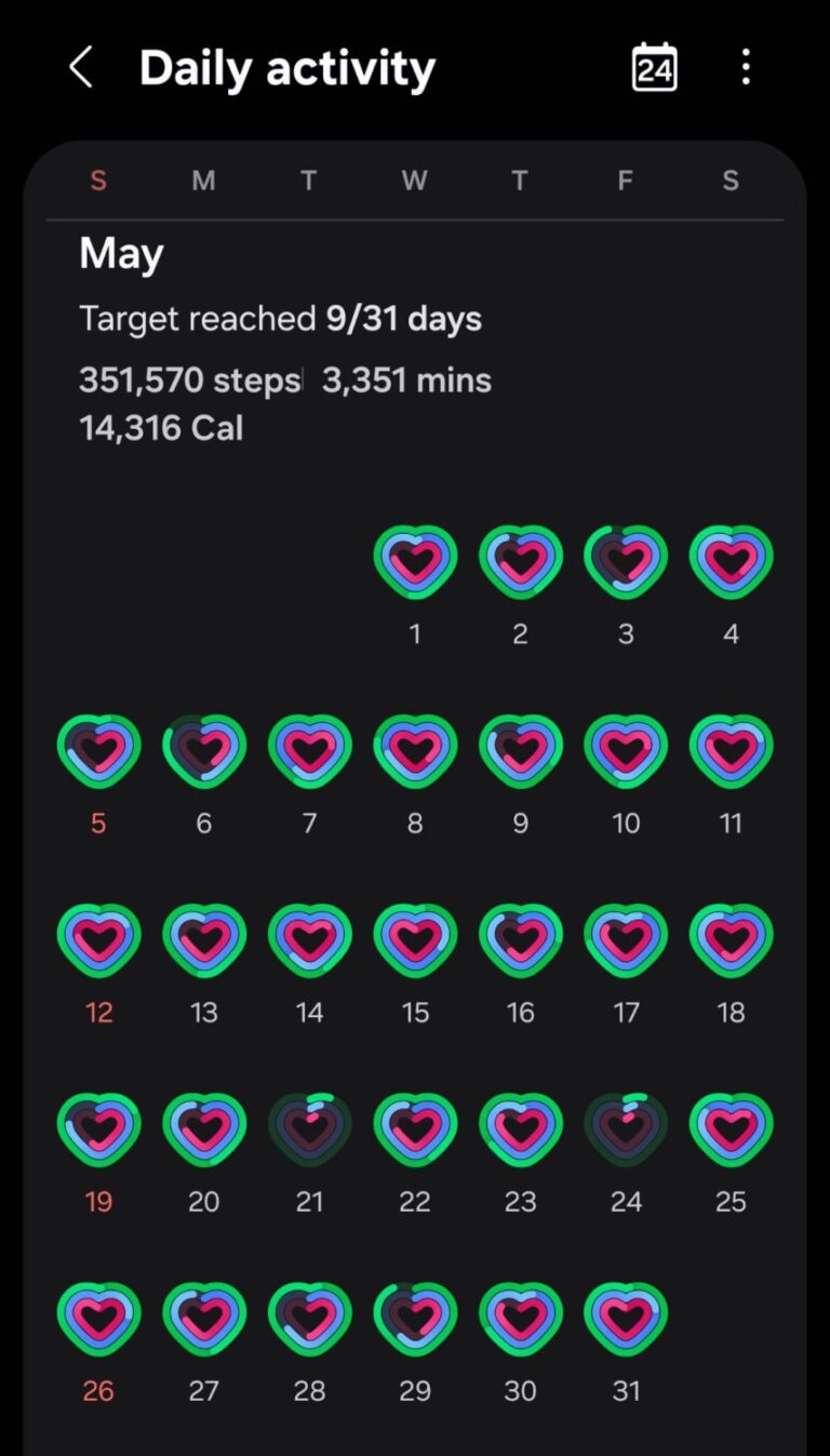 After a four-week reflection period beginning on February 19, I decided to eliminate my strict workout time block and focus on doing the day’s workout whenever I found a moment. I also rethought my overall approach and redesigned my exercise plan. I have since refined it to be even more effective, and every week I work out every muscle group in my body. My daily workout sessions are either an hour long or about an hour and twenty minutes, depending on the day. Weekends are reserved for cardio, since I spend a lot of time hiking or exploring my city. On average, I cover about 30 km on weekends, plus around 5 km each weekday.